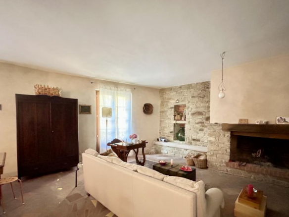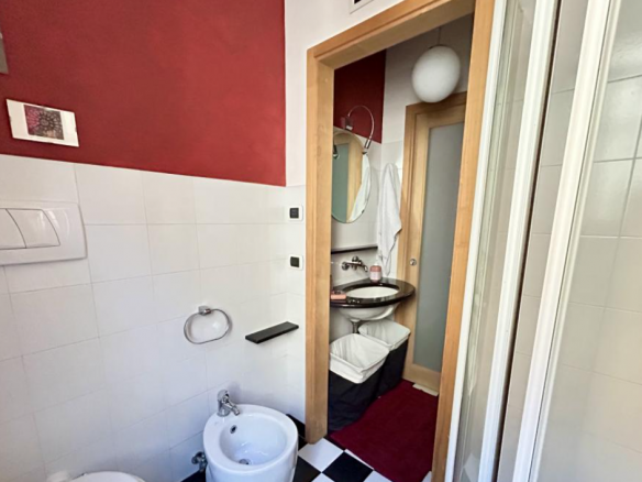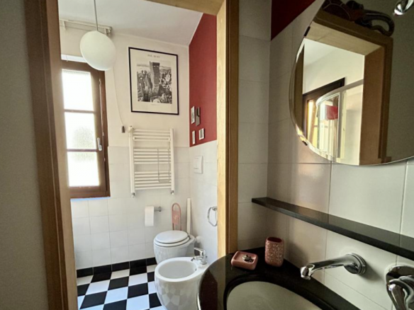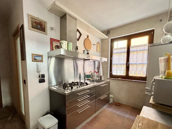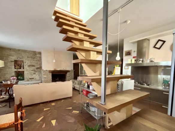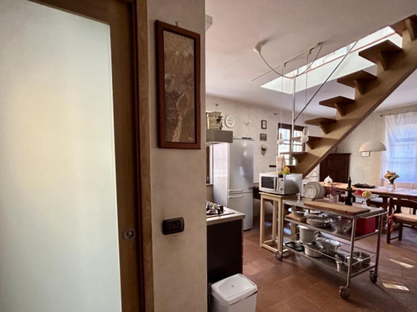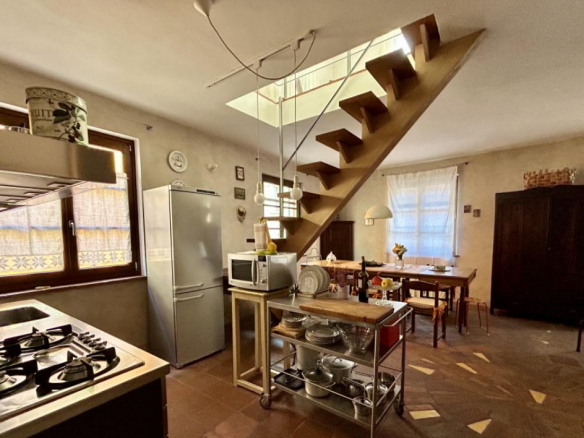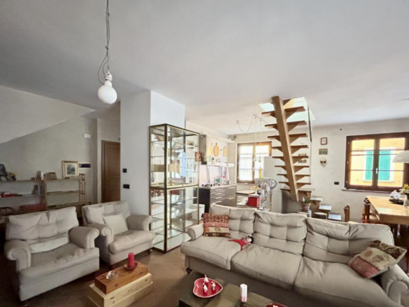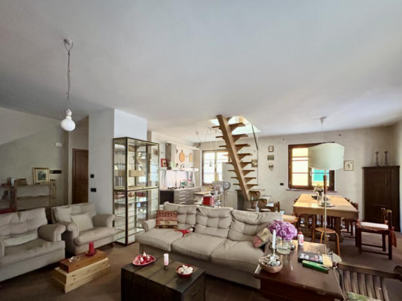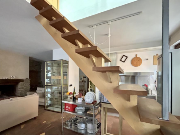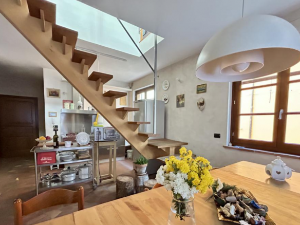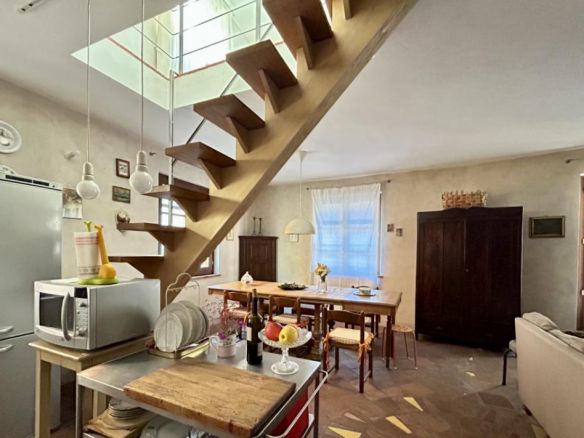 W centrum miejscowości Ponti, na sprzedaz odnowiony, dwupoziomowy apartament. Na pierwszym poziomie znajduje się jasny salon z otwarta kuchnią i jadalnia oraz łazienka.