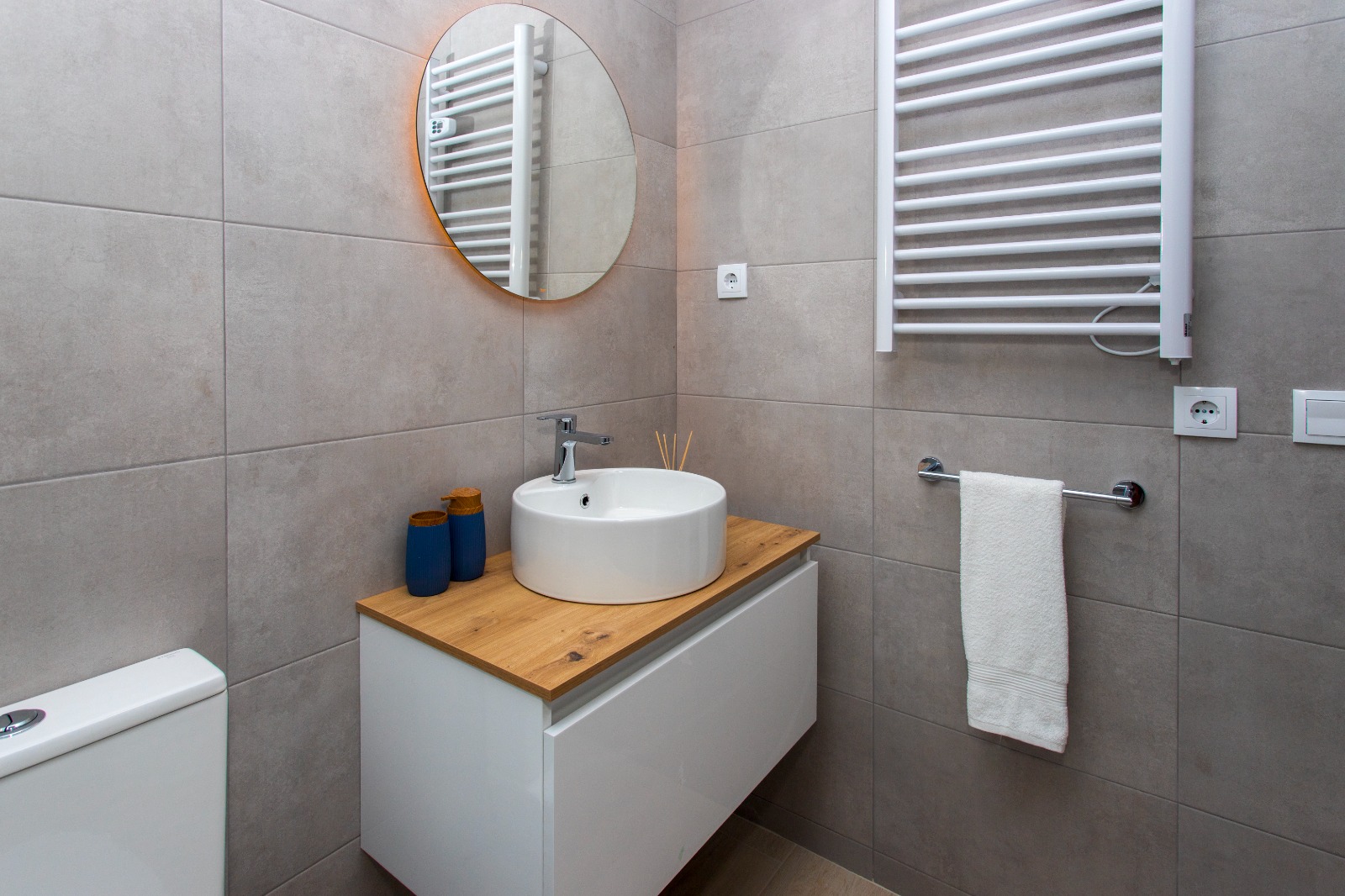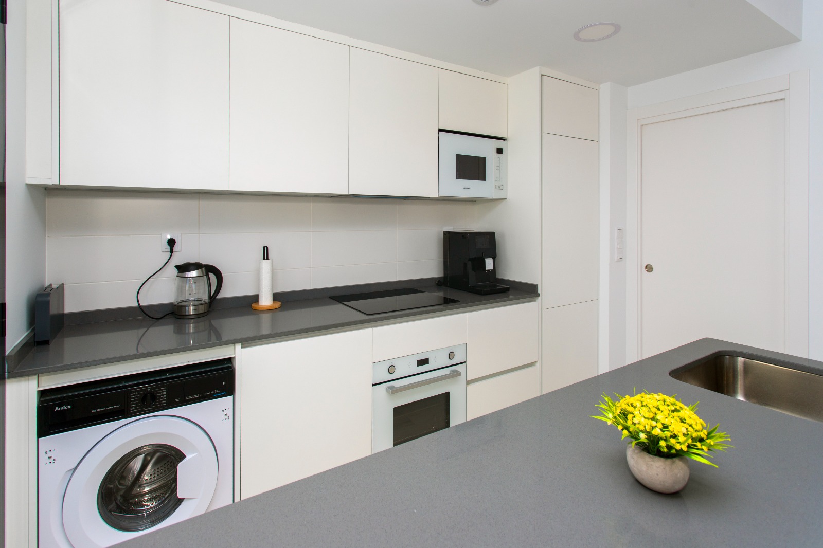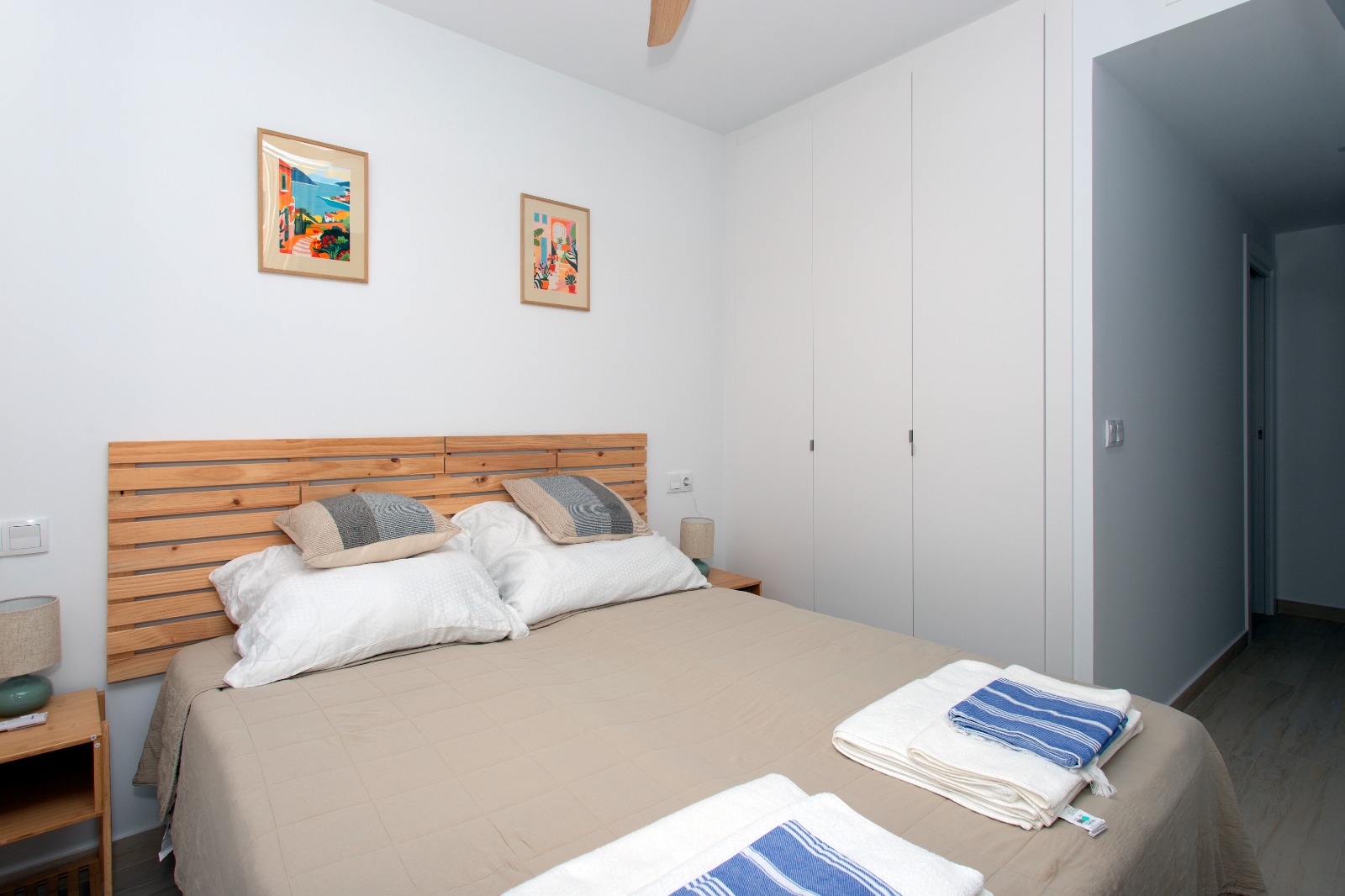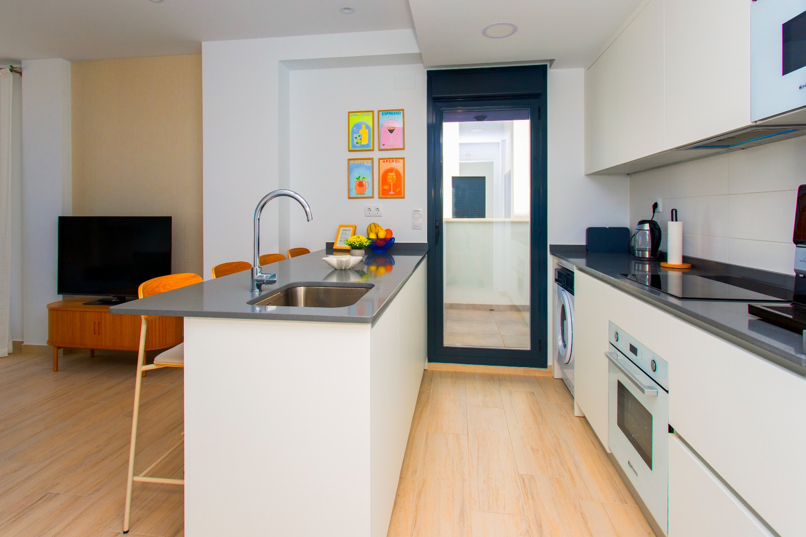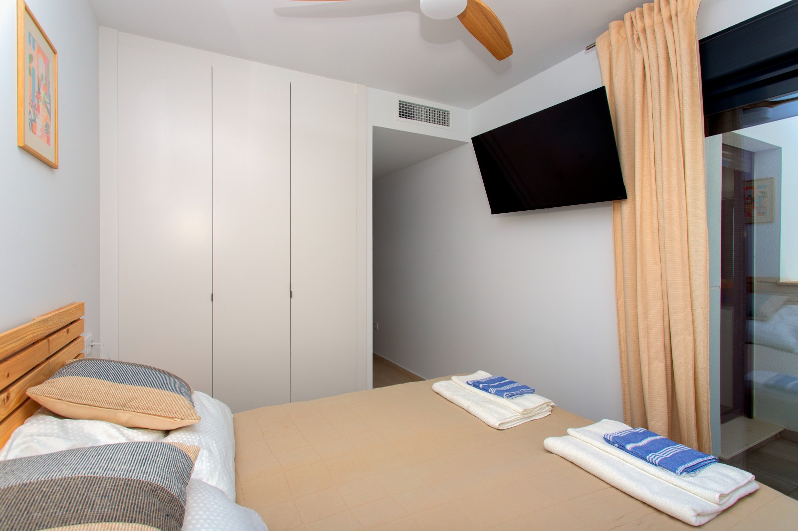 Apartament o powierzchni około 70 m² został zaprojektowany z myślą o wygodzie i funkcjonalności. Składa się z dwóch sypialni – jednej z łóżkiem podwójnym oraz drugiej z dwoma łóżkami pojedynczymi. Przestronny salon z rozkładaną sofą łączy się z aneksem kuchennym, tworząc jasną i przyjazną przestrzeń dzienną.