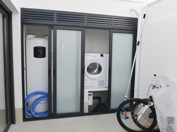 Drzwi i okna wykonano z PVC, wyposażając je w podwójne szyby laminowane dla lepszej izolacji. Duże przesuwne drzwi balkonowe posiadają rolety z napędem silnikowym, a pozostałe okna wyposażono w termiczne rolety aluminiowe. Drzwi wewnętrzne są drewniane, lakierowane na biało, a szafy wnękowe w sypialniach mają praktyczne wyposażenie obejmujące szuflady, półki i wieszaki.