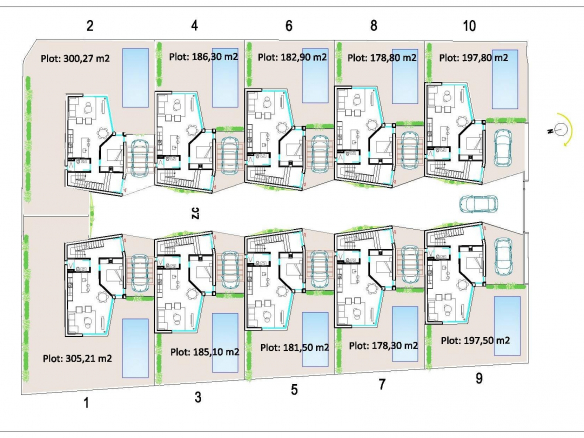 Każda z willi ma dwa piętra oraz przestronne solarium na dachu. W skład nieruchomości wchodzą: